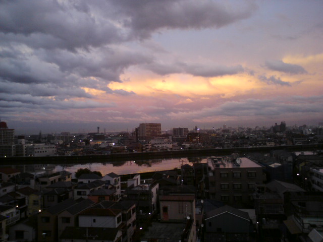 ↓夕方の空は、夕焼けと居座る雨雲との対比で不思議な空色。