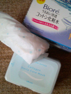 写真はドラッグストアでみつけたローションパック用に化粧水を染込ませたコットン(4層になっていて剥がして頬や額にのせることができます)。